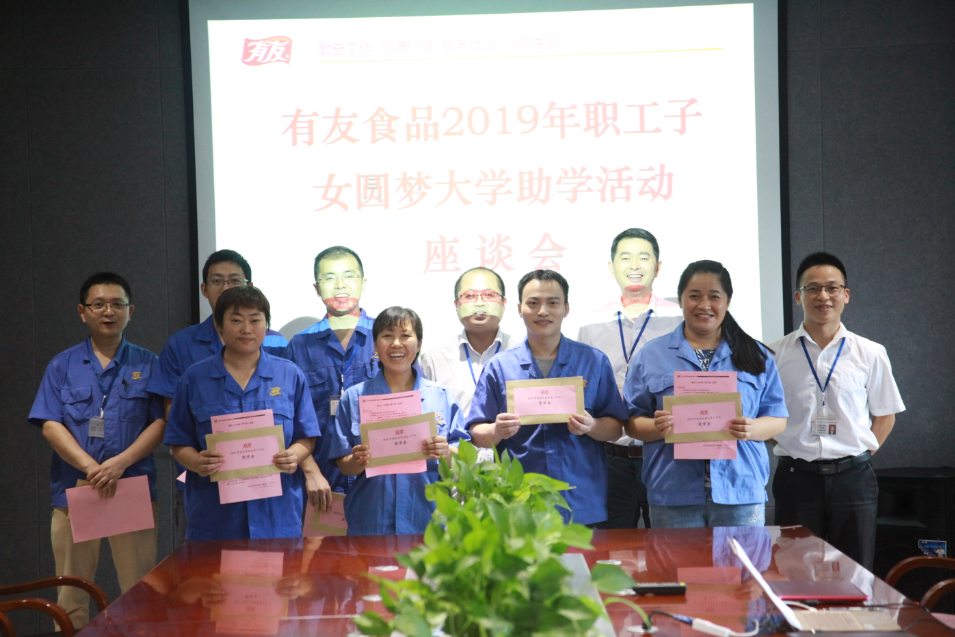 高层领导携有友部分职工一行,在璧山工业园基地举办了每年一度“职工子女圆梦大学助学活动”座谈会,现场为5名品学兼优、家庭困难的的职工子女发放助学金,帮助贫困学子圆大学梦。